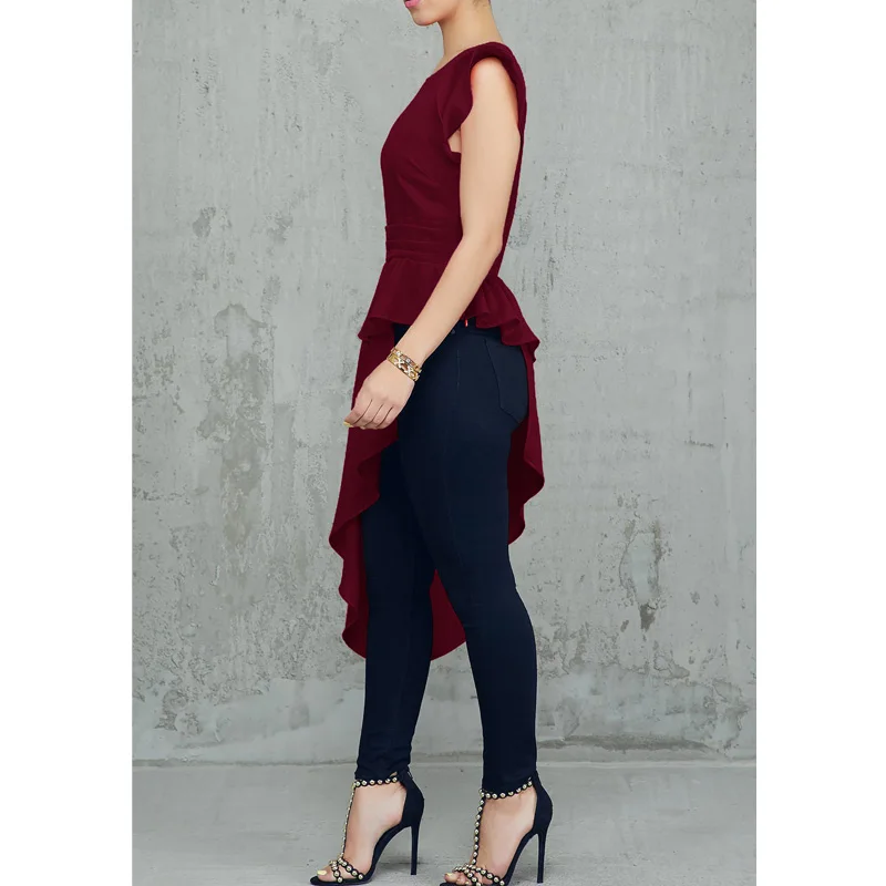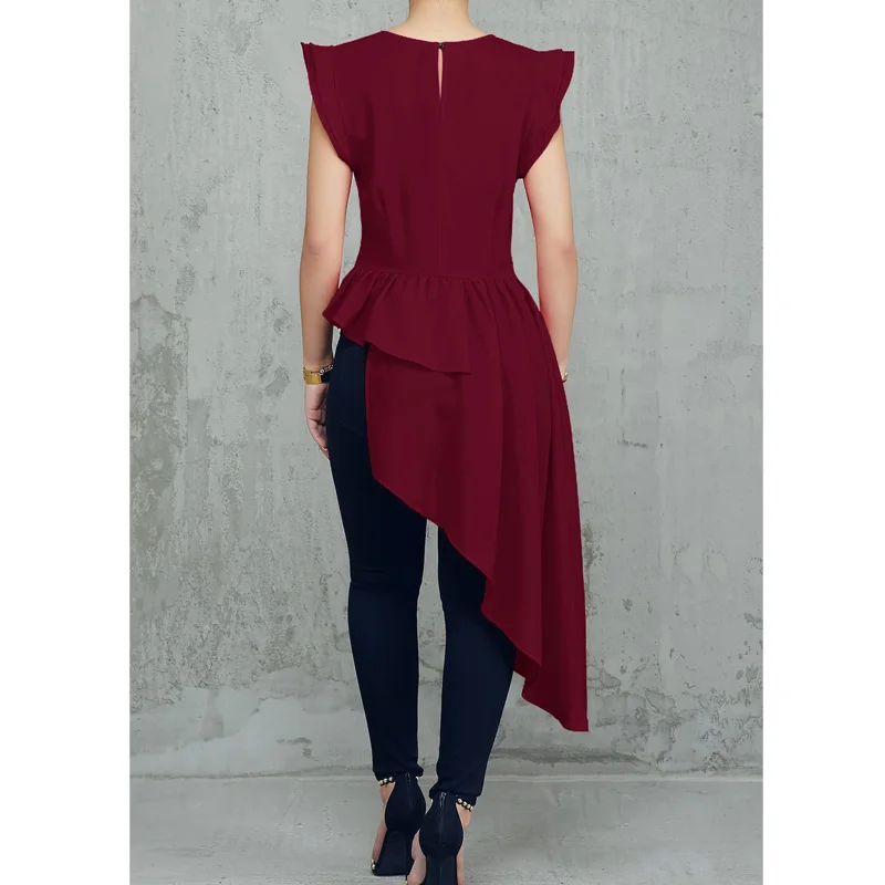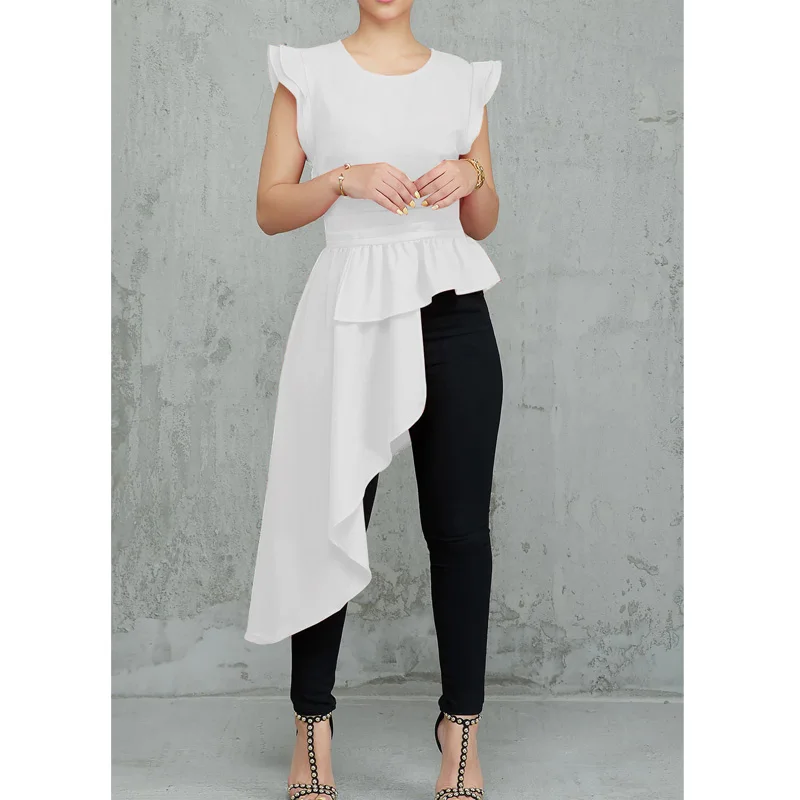 amazing New Fashion Women Ruffles Design Dip Hem Irregular Blouse Solid O-Neck Short Sleeve Asymmetric Hem