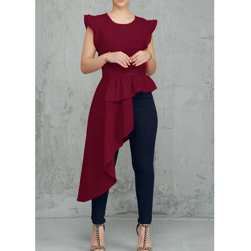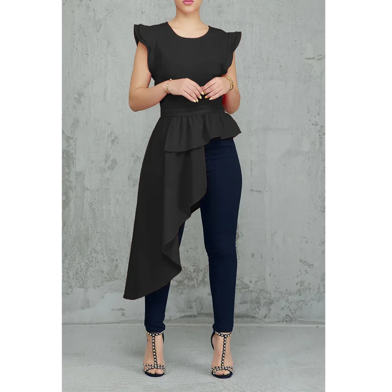 Finest New Fashion Women Ruffles Design Dip Hem Irregular Blouse Solid O-Neck Short Sleeve Asymmetric Hem