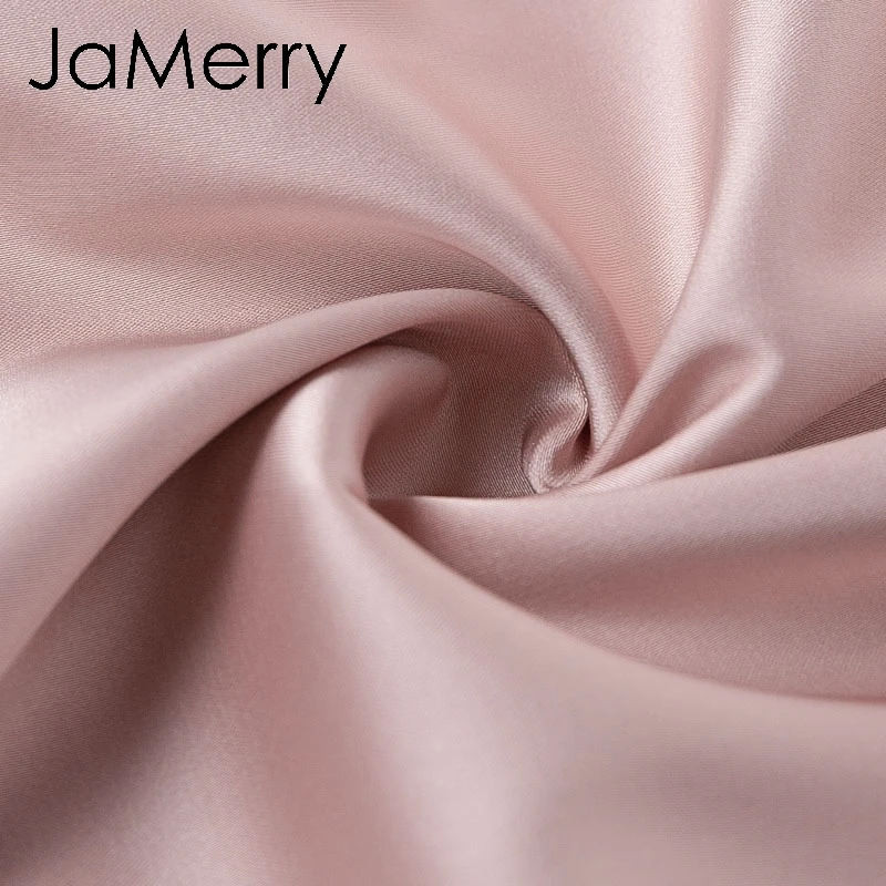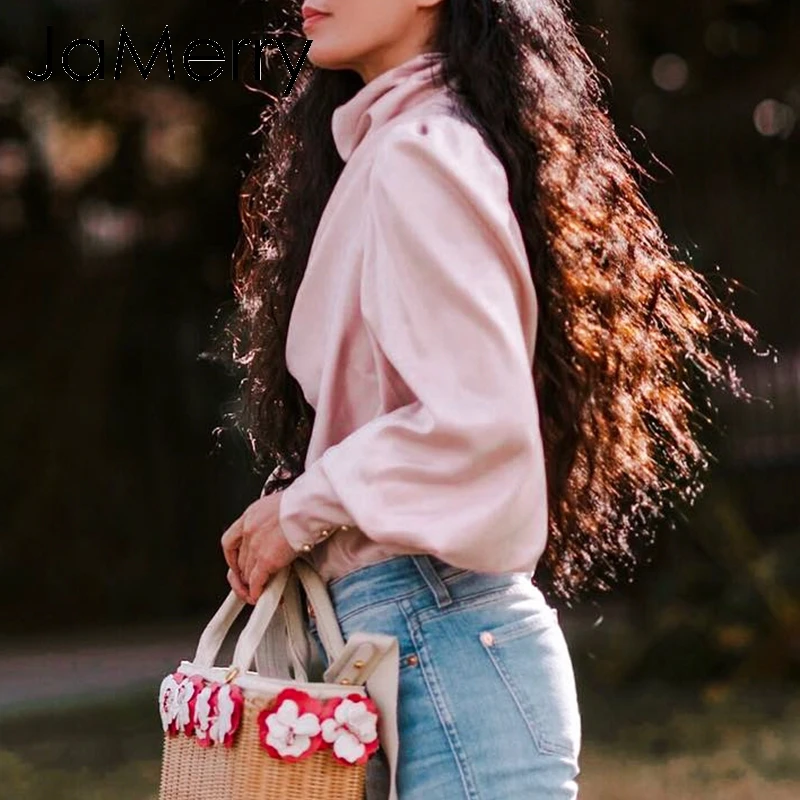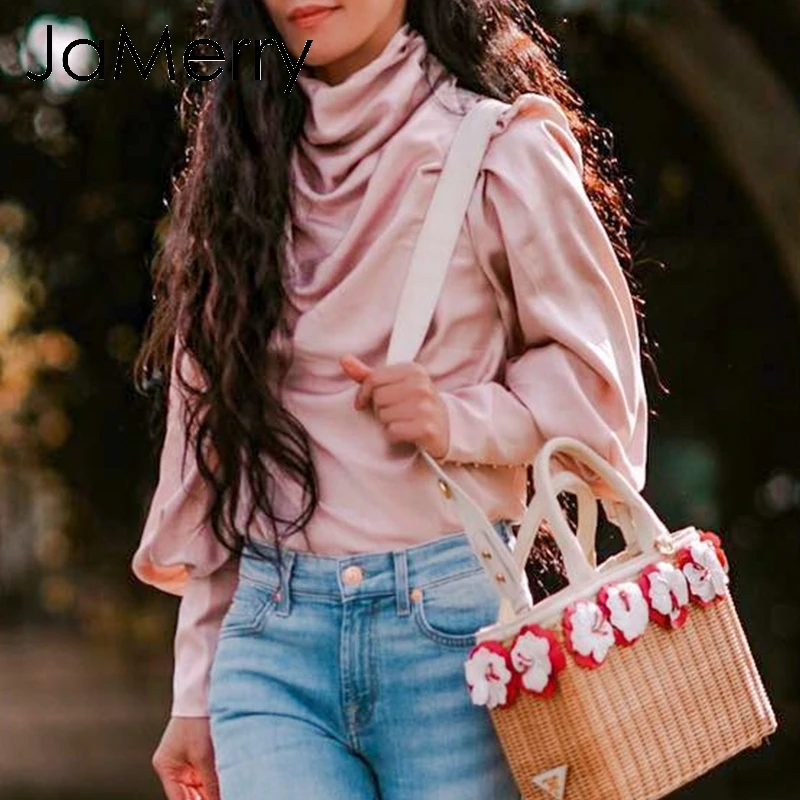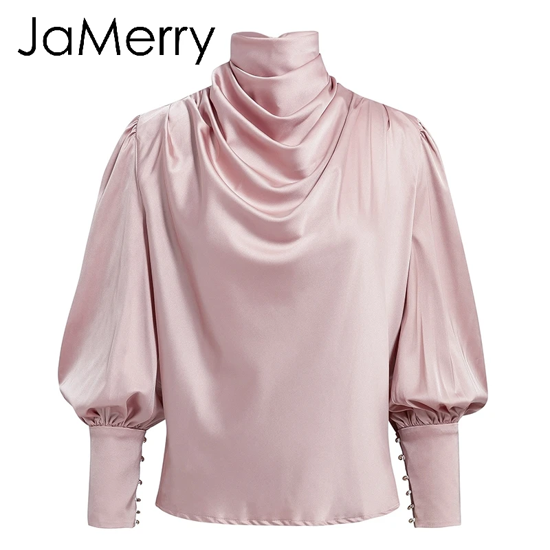 Best JaMerry Vintage pink satin women blouse Turtle neck pleated luxury blouse shirt Solid lantern sleev
