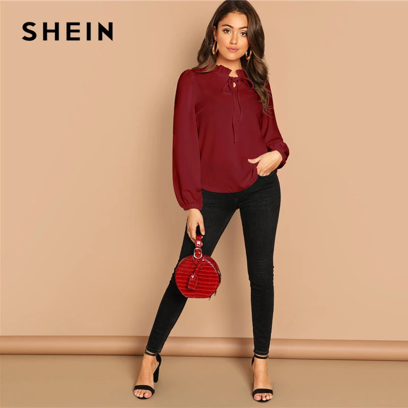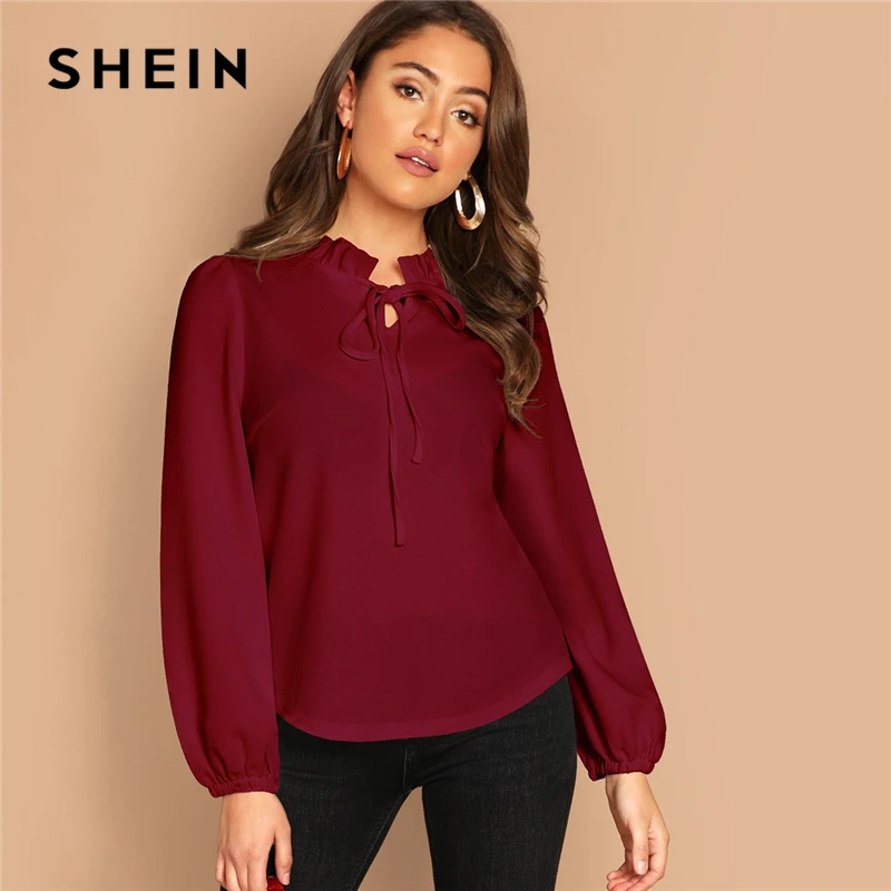 remarkable SHEIN Burgundy Frilled Neck Knot Solid Casual Top Women 2019 Spring Plain Womens Tops and Blouses L