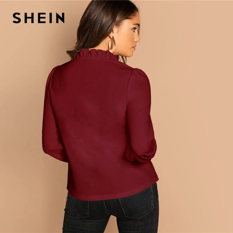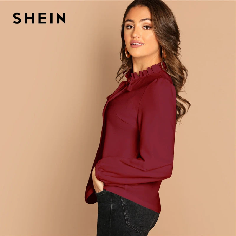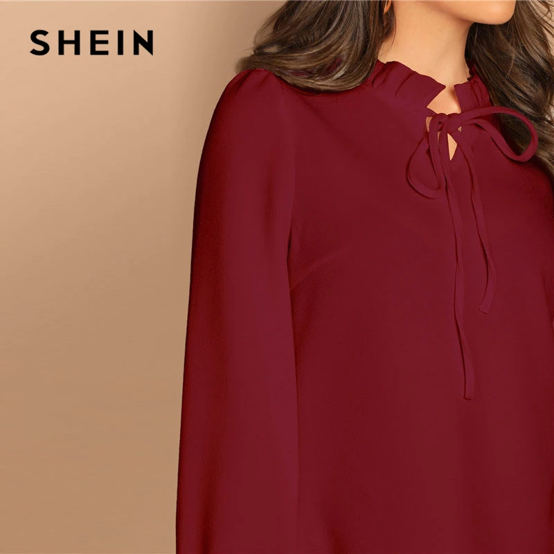 discount SHEIN Burgundy Frilled Neck Knot Solid Casual Top Women 2019 Spring Plain Womens Tops and Blouses L