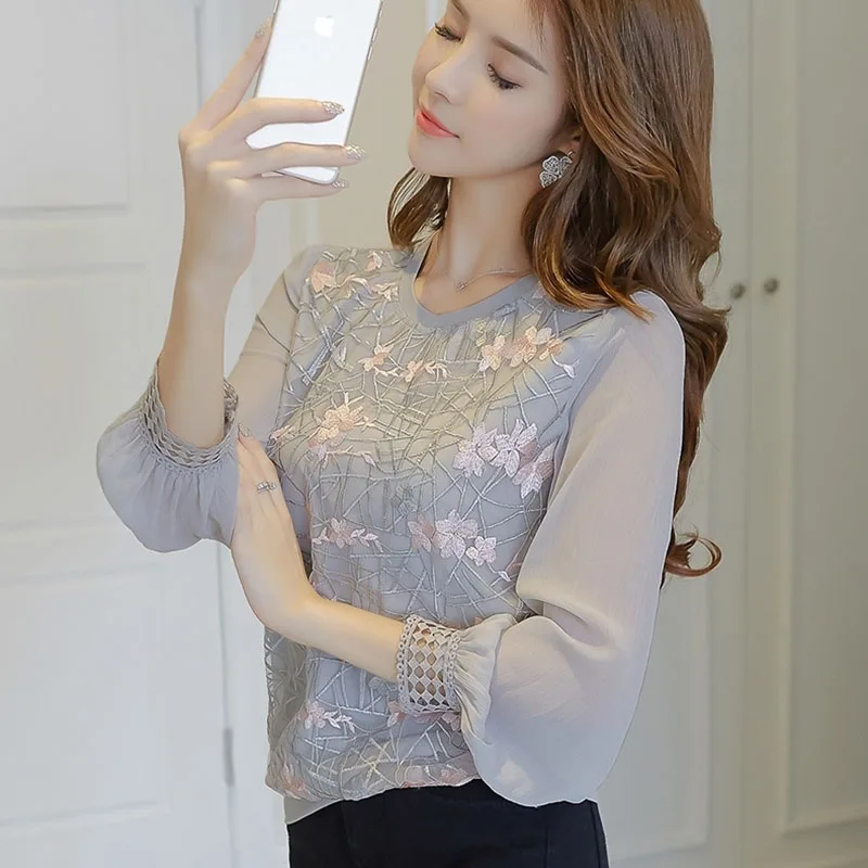 Best Women Long Sleeve Shirt Women New Floral Embroidery O Neck Lace Chiffon Blouses Blusa Ladies Casual