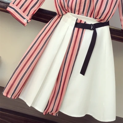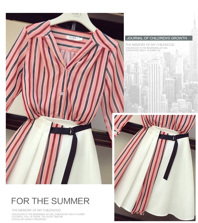 New High Quality Women Off Shoulder Striped Blouse Shirts+High Waist Button Mini Skirts 2 Pieces Clothi