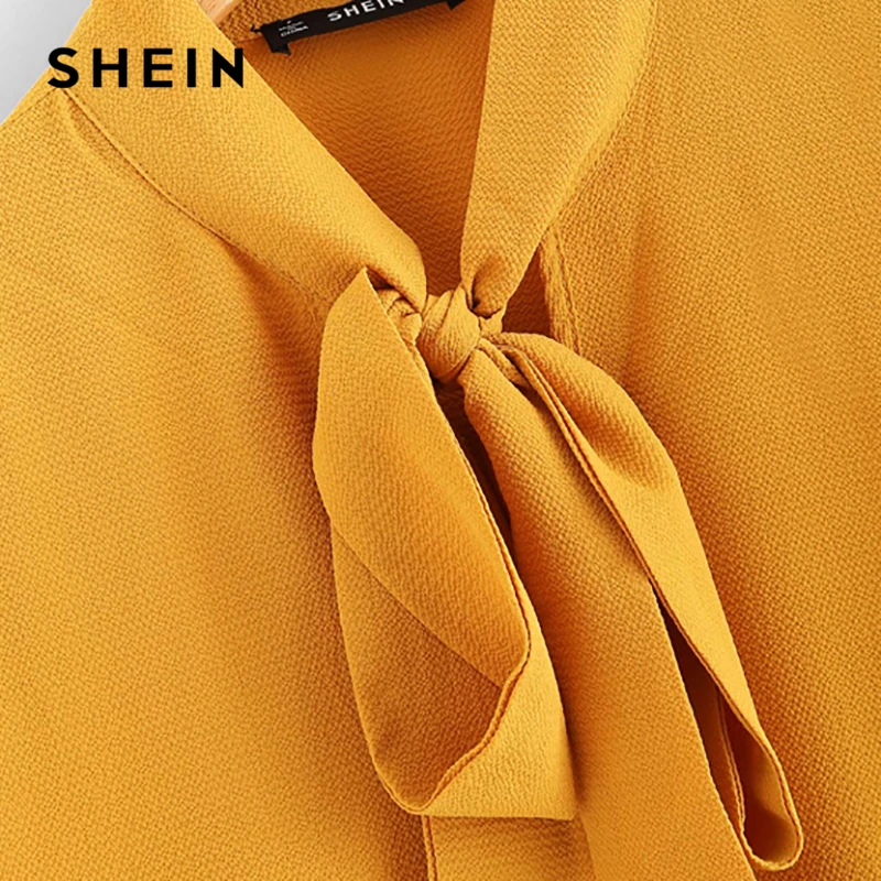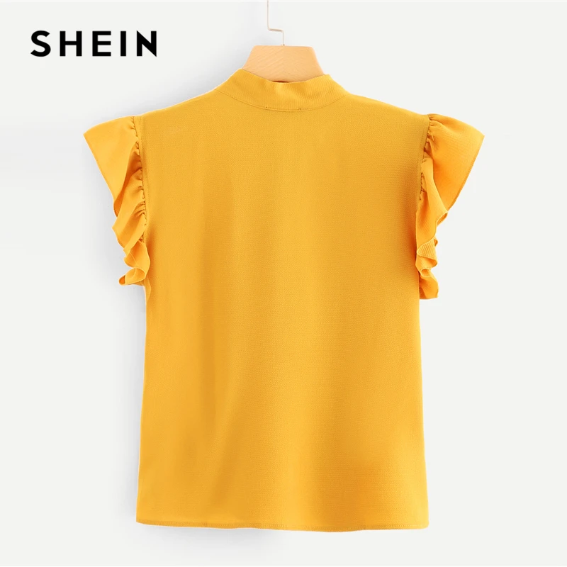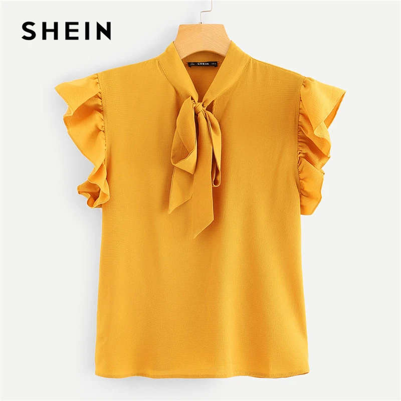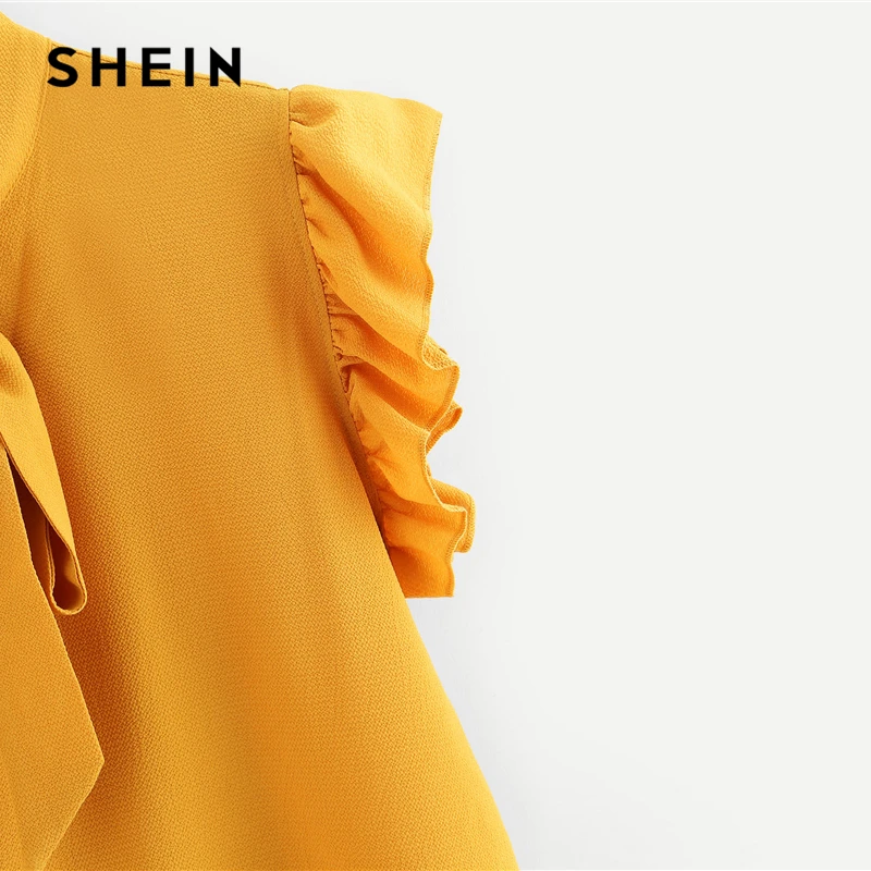 Best SHEIN Mustard Elegant Office Lady Flounce Shoulder Tied Neck Floral Solid Ruffle Blouse Summer Wome