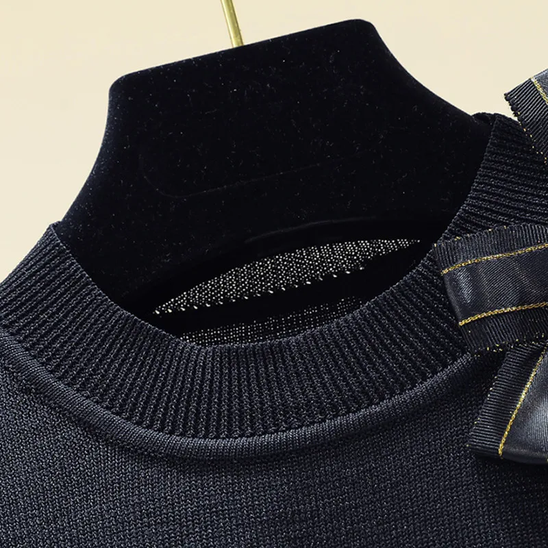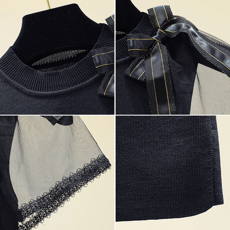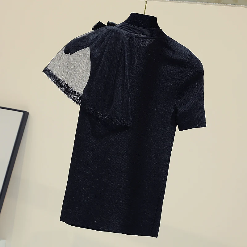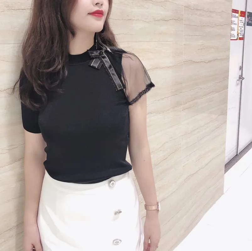 Best MUMUZI 2019 women t shirt black knitted tops bandage bow tee mesh patchwork short sleeve slim tshir
