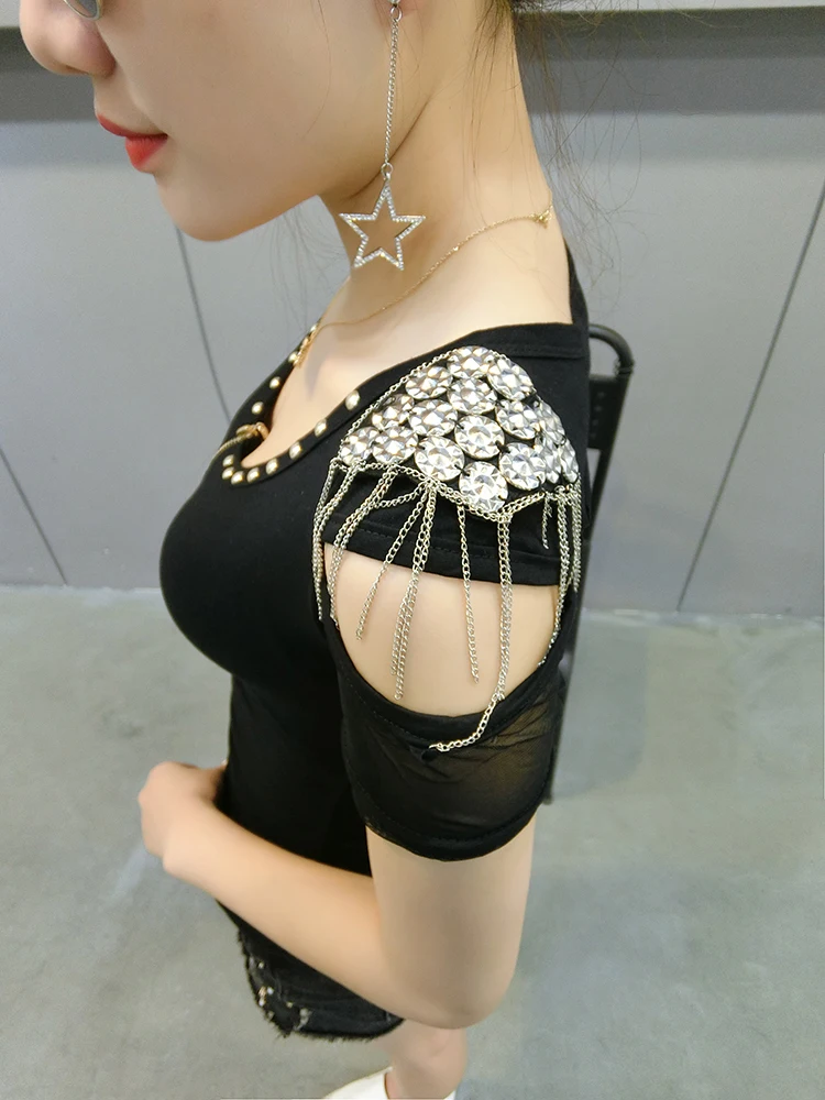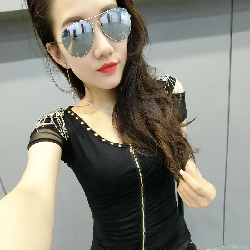 Finest Sexy Hollow Out Tshirt O-Neck Zipper Cardigan 2019 New Summer Women Shoulder Board Short Sleeve Top