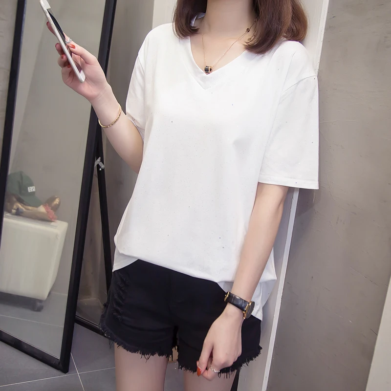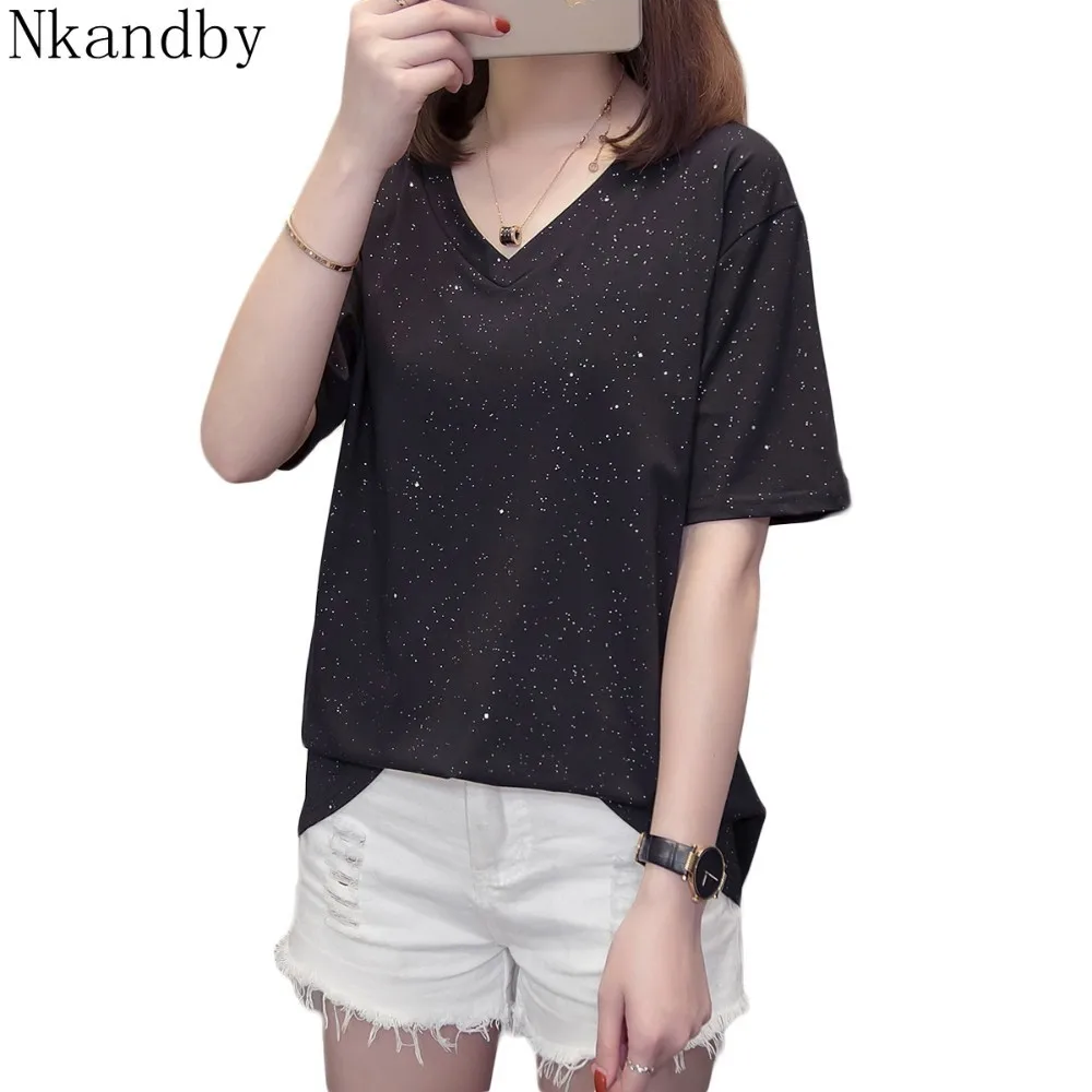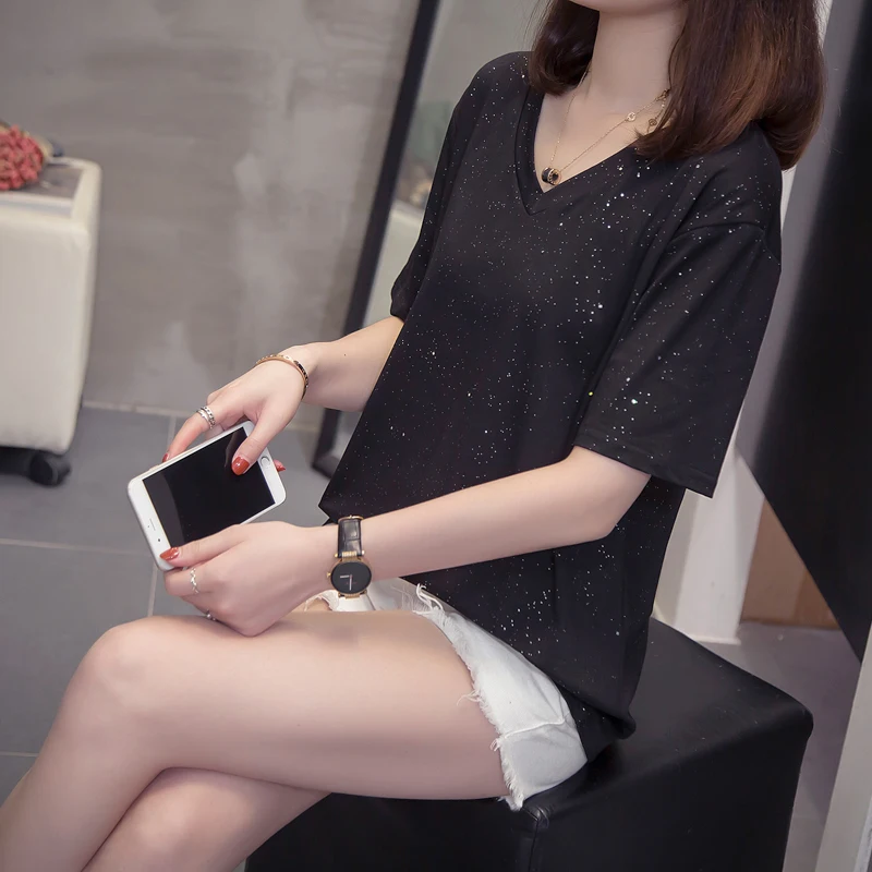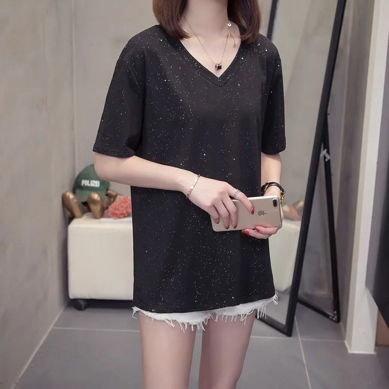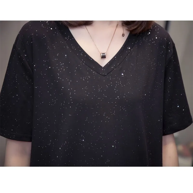 incredible Plus Size Shining Woman Tshirts Summer Korean Vogue V Neck Female T-Shirts Short Sleeve Tops Oversi