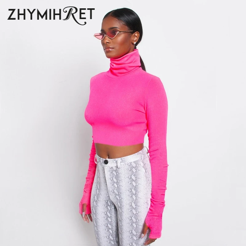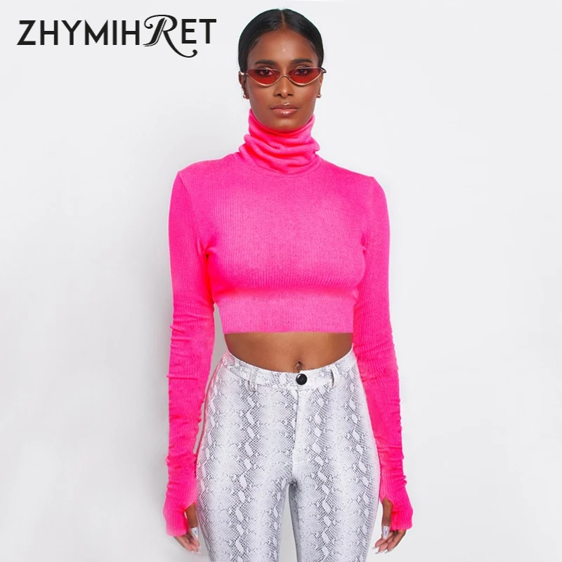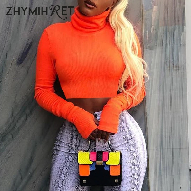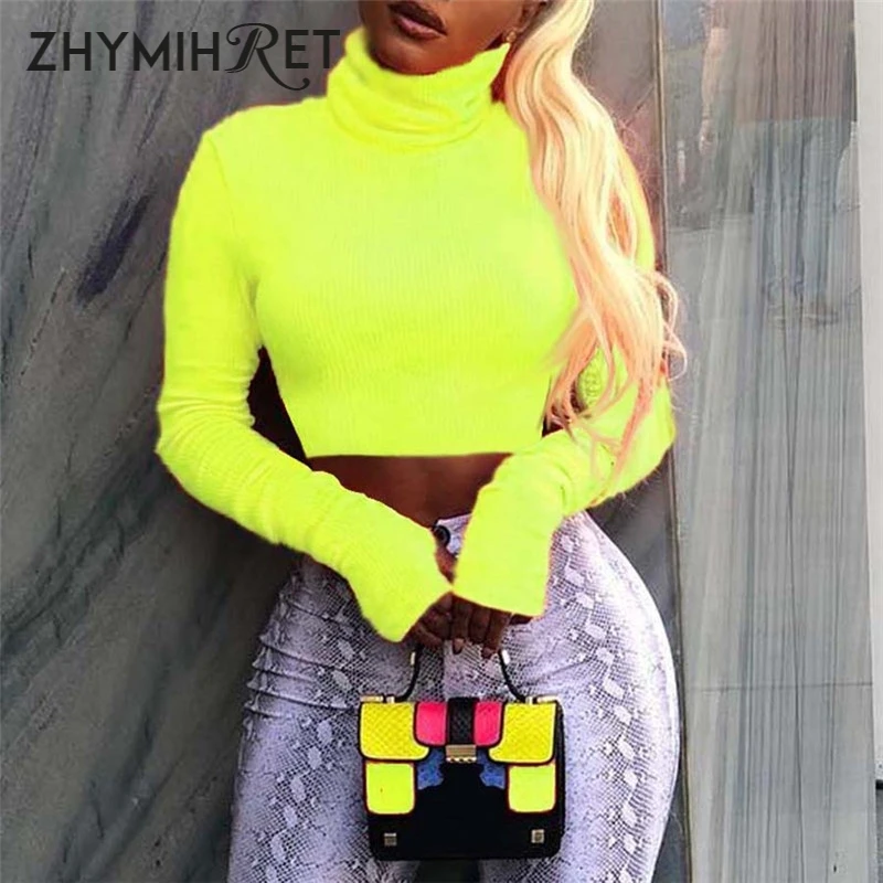 price reduction ZHYMIHRET Autumn Winter Neon Color Ribbed T Shirt For Women 2018 Long Sleeve Turtleneck Tshirt Knit